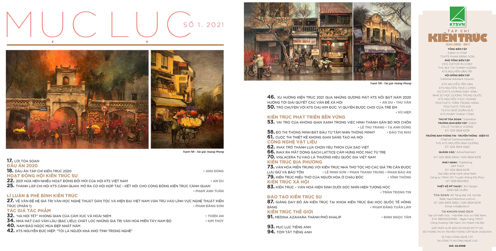 Chủ đề của Tạp chí số này mang đúng hương sắc khao khát của mùa xuân nhìn lại những hoạt động, dấu ấn mà Tạp chí Kiến trúc đã nỗ lực triển khai trong năm 2020, cùng những góc nhìn sẻ chia của KTS về những thách thức và xu hướng trong năm 2021. Đó chính là gợi mở những lối hướng để sáng tạo cất cánh; Nhóm những đốm lửa mong thành ngọn lửa nghề cháy sáng; đồng thời cũng giới thiệu những sáng tạo đầy khát khao trăn trở khẳng định bản địa đậm đà song hành với phát triển tiên tiến cho Kiến trúc nước nhà… Mong mỏi bạn đọc hãy cùng ưu tư, trải nghiệm mà không hề bỏ qua. Sau số này, sẽ nhận được càng nhiều hơn những bài viết gửi tới để làm cho Tạp chí năm mới thực sự mới!