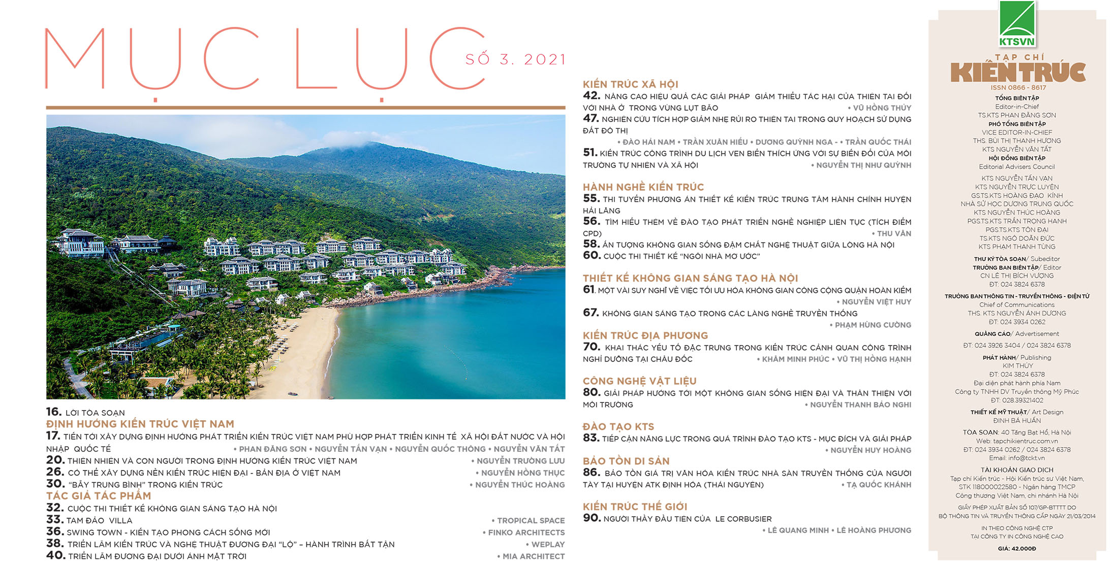 Ở số này, những bài nghiên cứu đa dạng về tìm kiếm bản sắc đích thực, ứng phó với thay đổi khí hậu cũng được các tác giả đề cập mạnh mẽ. Sự tiếp cận dòng chảy Kiến trúc cảnh quan – một trong 4 mảng ghép tạo nên bức tranh kiến trúc phục vụ đời sống đã được xới xáo đàm luận, nhất là hướng về nghiên cứu cho những không gian sáng tạo nơi thành phố sáng tạo. Những đề xuất đó nhằm làm đầy những khoảng trống một cách hữu ích cho cộng đồng, có đặt ra việc tự cân đối kinh phí để hoạt động bền vững.