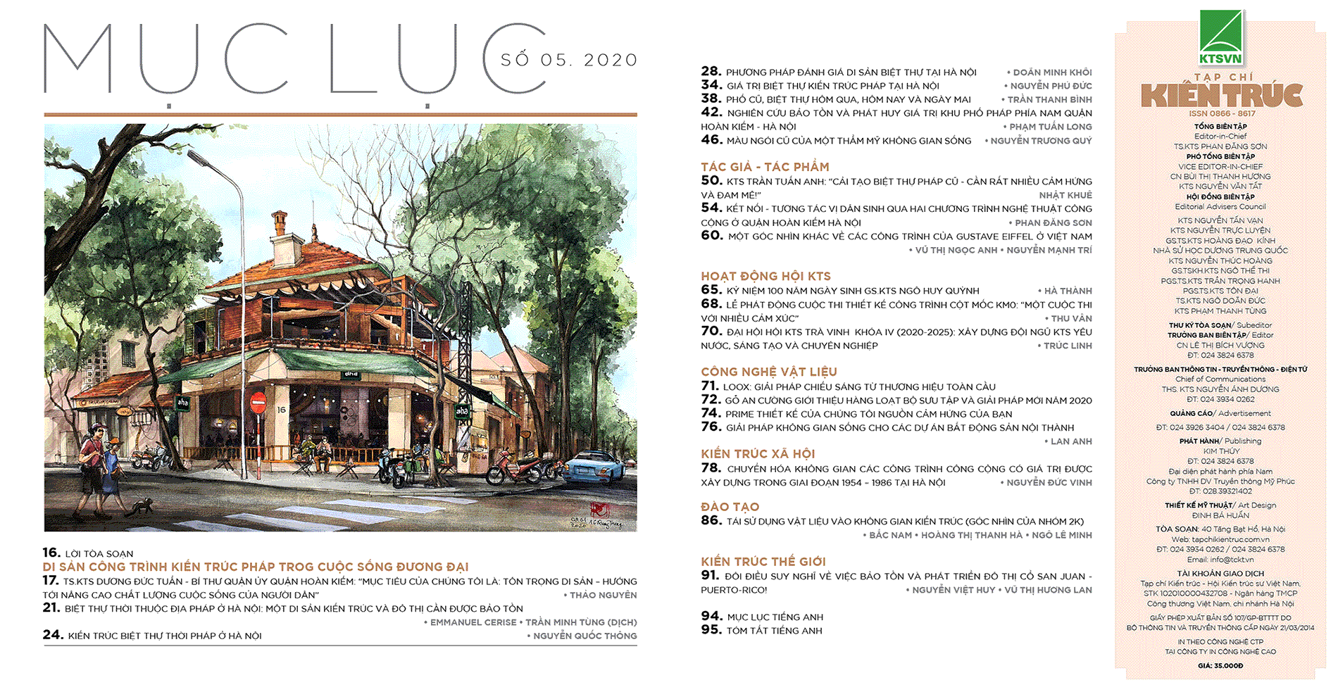 Trong số 5/2020, Tạp chí Kiến trúc trân trọng giới thiệu số Chuyên đề đặc biệt với Chủ đề: “Di sản công trình Kiến trúc Pháp trong cuộc sống đương đại” nhằm đánh giá một cách khách quan các tiềm năng, lợi thế, các cơ hội, thách thức; tìm kiếm các giải pháp bảo tồn và phát huy giá trị của các biệt thự kiến trúc Pháp nói chung và trên địa bàn quận Hoàn Kiếm nói riêng một cách hiệu quả, đồng thời giới thiệu tới độc giả các dự án cải tạo, đề xuất định hướng phát triển cho loại hình di sản kiến trúc đặc biệt của Thủ đô ngàn năm văn hiến.