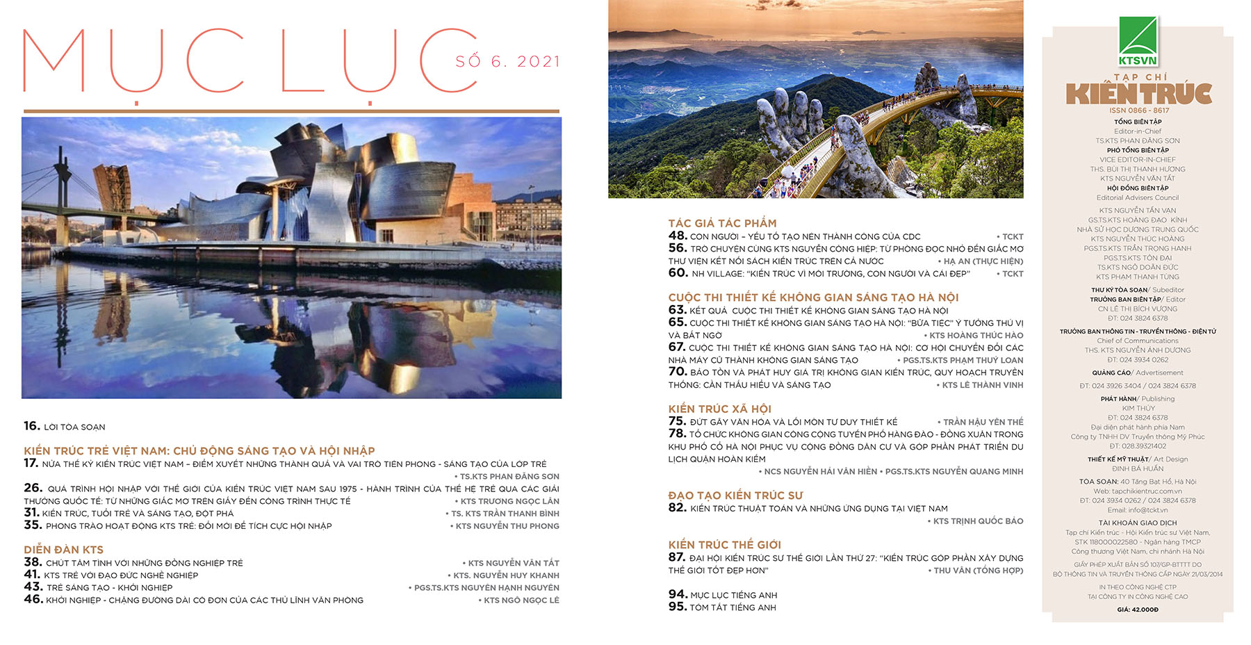 Đó là nội dung chính của Tạp chí Kiến trúc số 6/2021 với Chuyên đề đặc biệt: “Kiến trúc trẻ Việt Nam – Chủ động sáng tạo và hội nhập”. Các bài viết của nhiều thế hệ KTS đã khái quát một số hiện tượng và xu thế phát triển của kiến trúc trẻ Việt Nam, chạm đến những mong muốn của giới trẻ trên con đường đi đến thành công và hội nhập. Qua đó, sự trưởng thành của giới KTS trẻ trong dòng chảy kiến trúc gần 50 năm phản ánh những gương mặt KTS, những công trình tiêu biểu gắn với xu thế kiến trúc xanh, hiện đại và bản sắc.