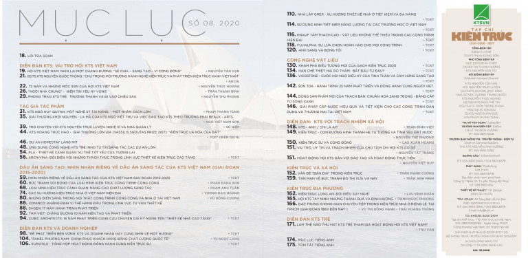 Tạp chí Kiến trúc số đặc biệt chào mừng Đại hội xin giới thiệu một số mạch – dòng, mảng – miếng đó. Trước hết là ý niệm tâm can giàu chất chuyên môn của Chủ tịch và Phó Chủ tịch Hội với những gì đã đi qua và những gì sắp tới. Đồng thời, một loạt bài trong số này đã cùng suy nghĩ, trao đổi những cảm nhận riêng của giới nghề về dấu ấn sáng tác, về lý luận phê bình, về KTS trẻ, về bản sắc kiến trúc và hoạt động các mặt của KTS nước nhà… Luật Kiến trúc vừa được ban hành với sự đóng góp can đảm kiên định của Hội cũng là một chủ đề mới mẻ.