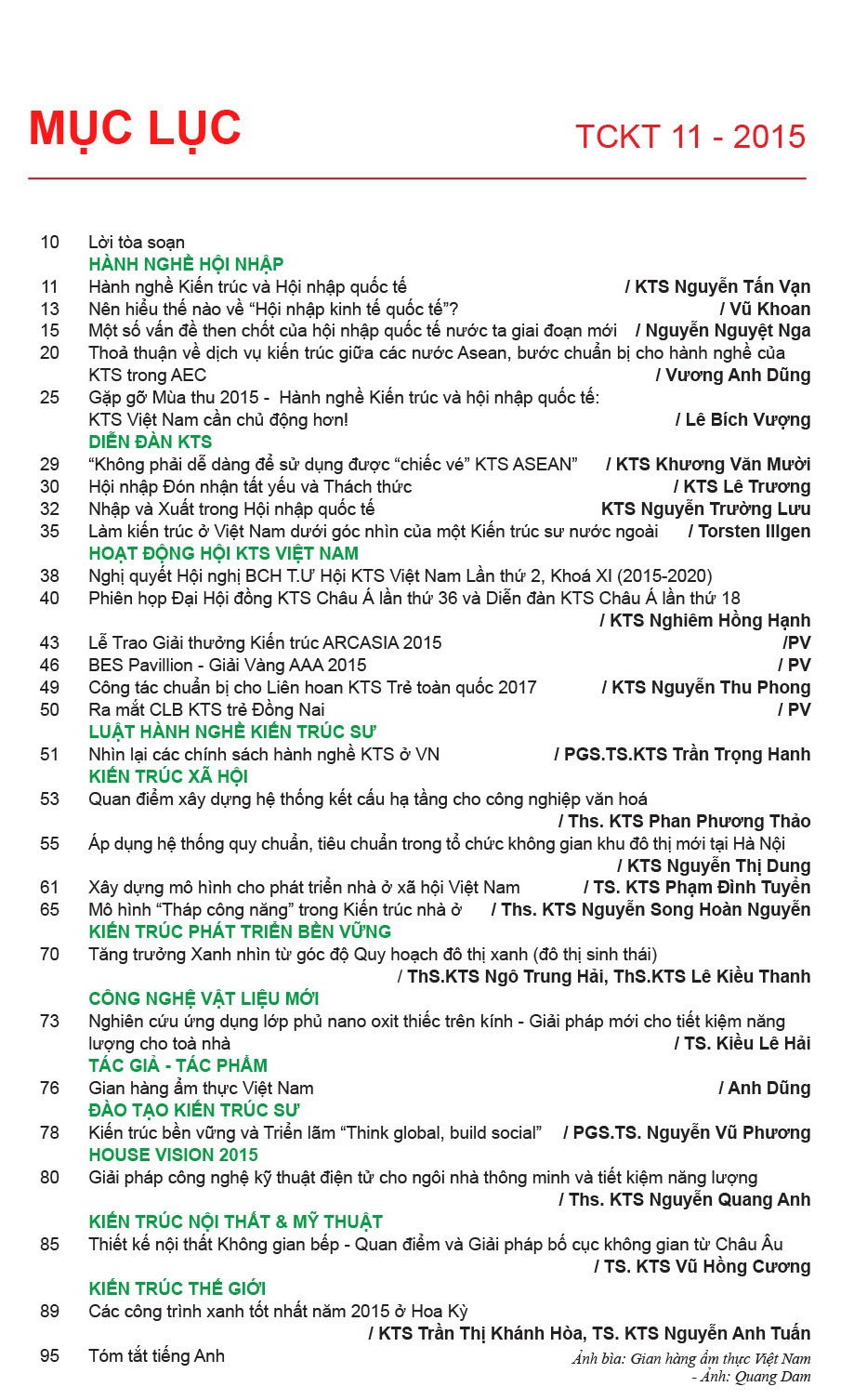 Một trong những nội dung quan trọng của TCKT số 11/2015 là phiên họp Đại hội đồng KTS châu Á lần thứ 36 và Diễn đàn KTS châu Á lần thứ 18 vừa diễn ra tại Ayutthaya (Thái Lan). Các vấn đề được thảo luận tại Diễn đàn lần này như: Nâng cao chất lượng đào tạo KTS; tạo môi trường hành nghề lành mạnh, hội nhập quốc tế cho KTS; nâng cao chất lượng môi trường sống; kiến trúc xanh và biến đổi khí hậu… Nhân dịp này, Lễ trao giải thưởng Kiến trúc Arcasia 2015 đã vinh danh những KTS xuất sắc nhất trong thời gian qua, trong đó Việt Nam vinh dự được nhận 02 giải Vàng và 2 giải Danh dự.