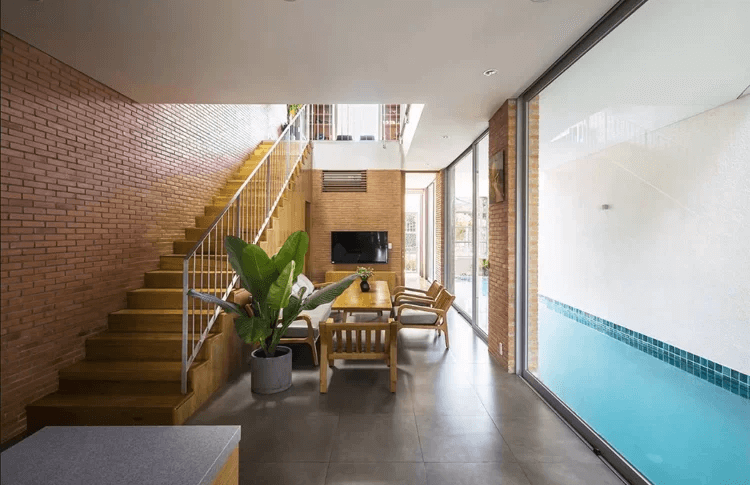 Ngoài 12 bậc thang bồn cây được lồng ghép xen kẽ và chạy liên tiếp từ tầng trệt lên đến sân thượng, ngôi nhà còn gây ấn tượng và thỏa mãn niềm đam mê bơi lội của chủ nhà bằng một bể bơi dài 11m ở ngay bên cạnh phòng khách. Xem thêm hình ảnh ngôi nhà tại đây.