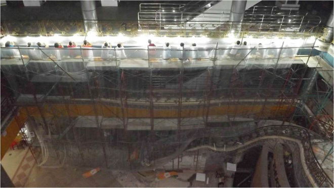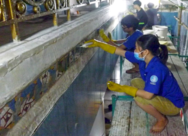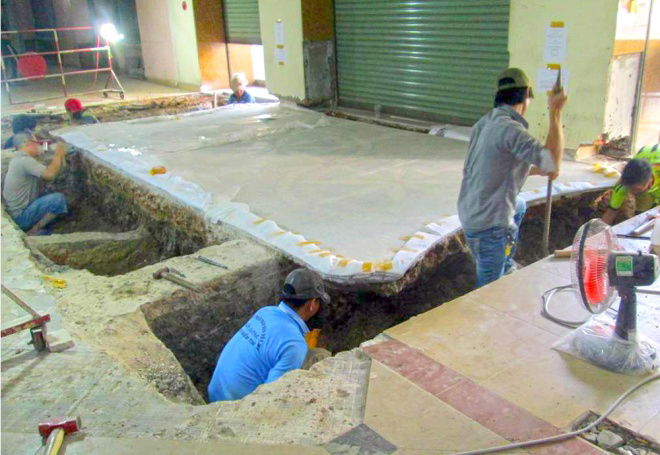 Các nhân viên khảo cổ làm việc liên tục trong hơn 3 tháng để hoàn thành việc bóc tách thảm gạch mosaic bên trong Thương xá Tax Sài Gòn.