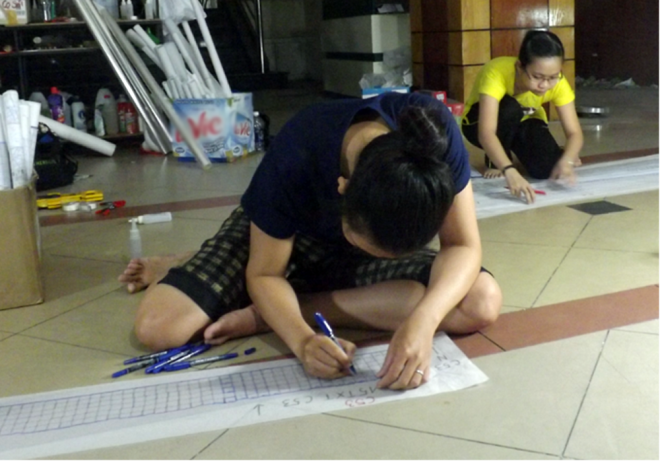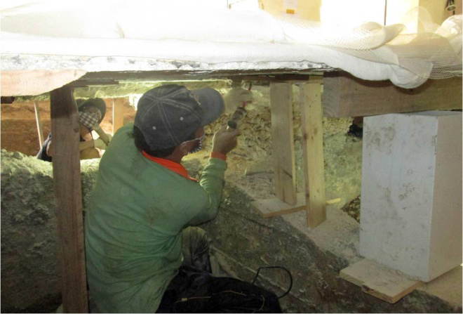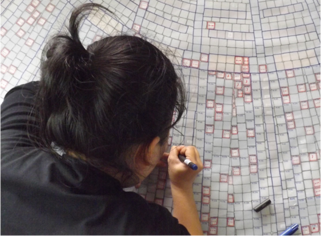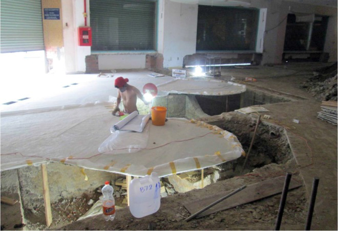 Nhân viên khảo cổ điền thông tin, ký hiệu bản vẻ trước khi tiến hành bóc tách thảm gạch mosaic.