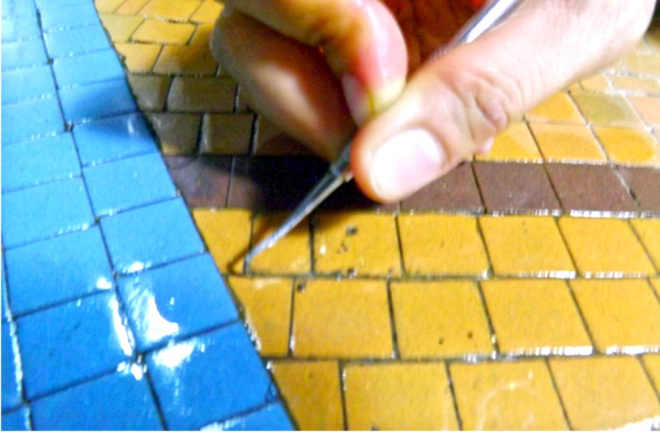 Vị trí, màu sắc từng viên gạch được ghi chú, đánh dấu cẩn thận. Đơn vị thi công cũng chụp không ảnh (chụp từ trên cao) để bảo đảm sau khi bóc tách, việc lắp đặt lại ở cầu thang công trình mới sẽ giống hoàn toàn như nơi cũ.