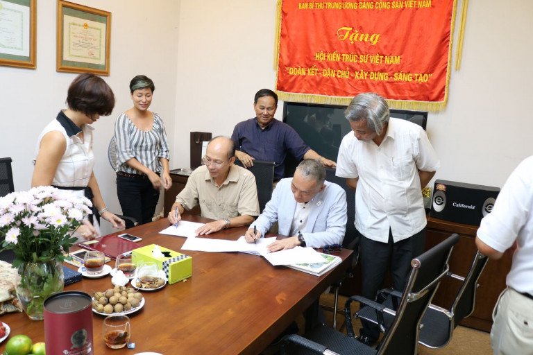Cũng tại buổi gặp gỡ, ông Hideki Asami đã tặng hoa và chúc mừng PGS.TS. KTS Nguyễn Quốc Thông với trọng trách Tổng biên tập Tạp chí Kiến trúc – Hội KTS Việt Nam. Đồng thời, Công ty Nikken Sekkei Civil Engineering và Tạp chí Kiến trúc đã ký Bản ghi nhớ hợp tác nhằm thúc đẩy quan hệ hợp tác giữa 2 bên theo chiều hướng tích cực. Được biết trong khoảng thời gian 2012 – 2017, giai đoạn khó khăn của thị trường Bất động sản, Công ty Nikken Sekkei Civil Engineering đã hỗ trợ Tạp chí Kiến trúc rất nhiều trong việc triển khai những nội dung liên quan đến Quy hoạch và dự án công ty thực hiện tại Việt Nam. PGS.TS.KTS Nguyễn Quốc Thông hy vọng trong thời gian tới, Tạp chí Kiến trúc sẽ hợp tác tích cực hơn nữa với Nikken Sekkei Civil Engineering, giới thiệu đến được đông đảo bạn đọc cả nước những công nghệ tiên tiến trong lĩnh vực qui hoạch – kiến trúc của Nhật Bản. Trong thời gian sớm nhất, Tạp chí Kiến trúc và Nikken Skkei Civil Engineering có thể cho ra mắt ấn phẩm giới thiệu về những công trình, dự án mà Niken Sekkei Civil Engineering đã thực hiện tại Việt Nam và trên toàn thế giới.