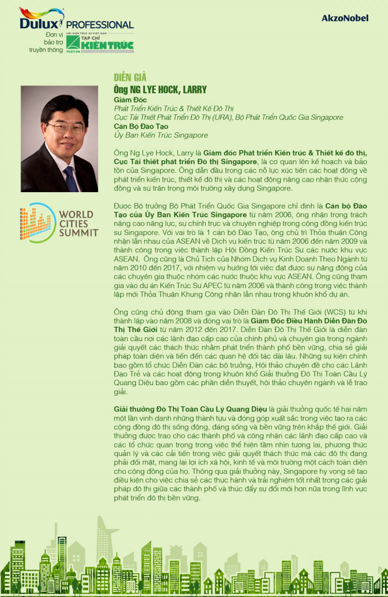 - ThS. KTS. Ng Lye Hock, Larry – Giám đốc Phát triển Kiến trúc & Thiết kế đô thị, Cục Tái thiết phát triển Đô thị (URA), Bộ Phát Triển Quốc Gia Singapore