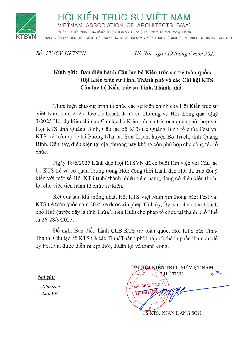 Thực hiện chương trình tổ chức các sự kiện chính của Hội KTS Việt Nam năm 2025 theo kế hoạch đã được Thường vụ Hội thông qua: Quý 3/2025, Hội dự kiến chỉ đạo Câu lạc bộ kiến trúc sư trẻ toàn quốc phối hợp với Hội kiến trúc sư tỉnh Quảng Bình, CLB Kiến trúc sư trẻ Quảng Bình, tổ chức Festival kiến trúc sư trẻ tại Phong Nha, xã Sơn Trạch, huyện Bố Trạch, tỉnh Quảng Bình. Đến nay, điều kiện tại địa phương này không còn phù hợp cho công tác tổ chức.