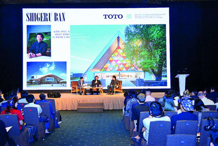KTS Shigeru Ban: Lúc đầu thì chỉ xuất phát từ việc tôi thích đi du lịch, thích trải nghiệm, thích được ăn các món ăn khác nhau. Từ đi và trải nghiệm nhiều ta sẽ đam mê và rất đồng cảm với mọi người dân trên thế giới. Tôi đã thấy các KTS trẻ của Việt Nam đã được học rất nhiều ở nước ngoài. Các bạn đi học ở nhiều trường khác nhau trên thế giới. Vậy các bạn hãy trải nghiệm nhiều hơn, điều đó giúp các bạn rất nhiều. Tôi nghiệm thấy điều này: Chính trong quá trình đi nhiều, trải nghiệm nhiều và được làm các công trình thực tế, dần dần các nơi họ biết đến và mời tôi nhiều hơn. Và sau đó, tôi lại có điều kiện để tiếp tục đi.
