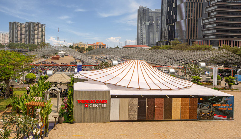 Một trong những gian hàng ấn tượng tại triển lãm là không gian trưng bày các giải pháp kiến trúc và xây dựng xanh của Trần Đức Homes Center với các giải pháp về xử lý nguyên liệu gỗ, cấu kiện gỗ – gỗ phối hợp cấu kiện thép, giải pháp mái – vách – trần – sàn, cửa ứng dụng công nghệ gỗ Thermo, ứng dụng kim loại mỹ thuật trong kiến trúc và nội thất, giải pháp nội ngoại thất cho khách sạn – nghỉ dưỡng và những giải pháp cho ngôi nhà xanh cao cấp và tiện dụng Ecolux Homes