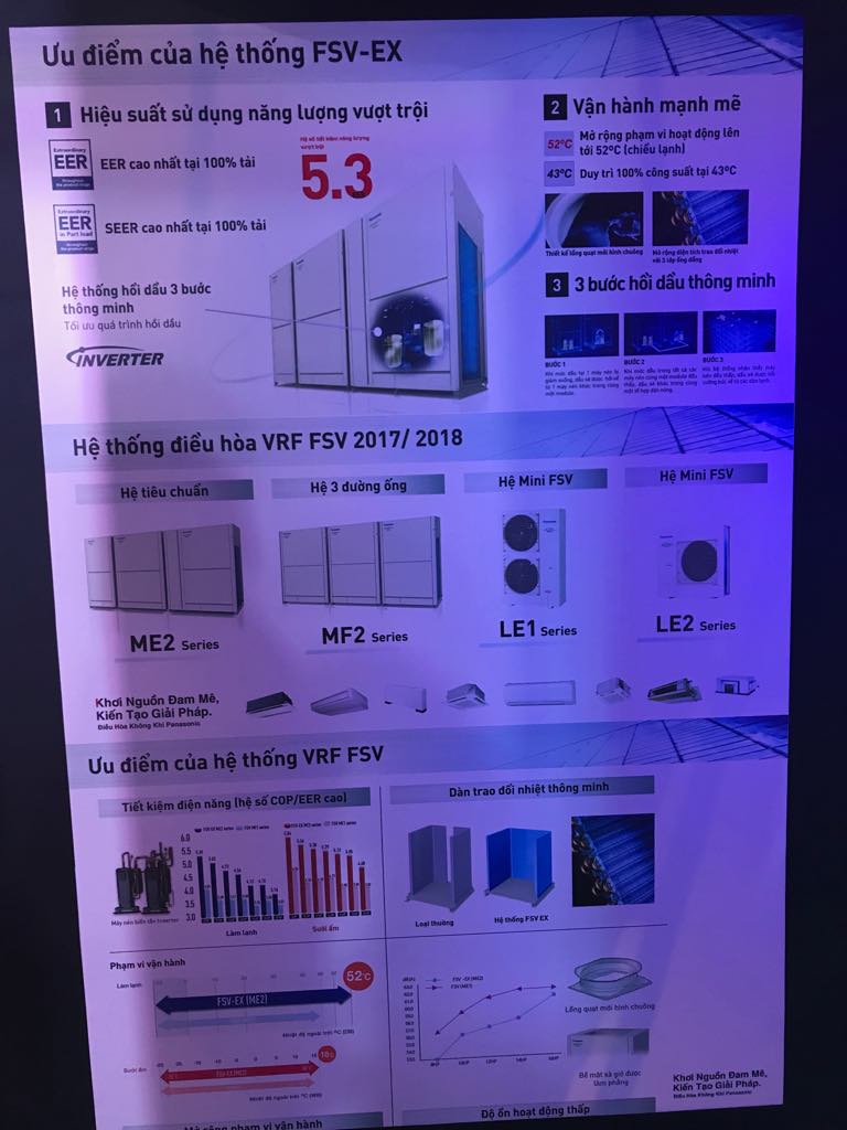 Tại Hội thảo, Panasonic giới thiệu đồng bộ hệ thống giải pháp IAQ và điều hòa không khí. Trong đó, hệ thống giải pháp IAQ giải quyết hoàn toàn vấn đề chất lượng không khí trong xây dựng nhà ở tại các đô thị, đảm bảo không gian sống hài hòa gồm 4 yếu tố cơ bản là nhiệt độ – thoáng khí – độ ẩm – sạch khuẩn với nhiều sản phẩm từ điều hòa không khí, hệ thống thông gió, các loại quạt gió và máy lọc không khí. Đặc biệt, hệ thống điều hòa không khí VRF với hiệu suất tiết kiệm năng lượng vượt trội thể hiện qua chỉ số tiết kiệm năng lượng EER 5.3. Bên cạnh đó, Panasonic còn cung cấp giải pháp tấm năng lượng mặt trời HIT với công nghệ ghép nối silicon và bề mặt kim tự tháp giúp tối ưu hóa việc hấp thụ và tạo ra năng lượng trong quá trình sử dụng.
