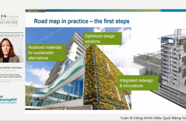 Các biện pháp nhằm giải quyết lượng phát thải khí nhà kính trong phạm vi một công trình cũng được thảo luận tại hội thảo. Dưới góc độ của đơn vị tư vấn thiết kế xây dựng, ThSKH Esther Gerritsen – Chuyên gia Tư vấn tối ưu năng lượng phát triển bền vững, Công ty TNHH HaskoningDHV Vietnam cho biết: “Chúng tôi áp dụng các nguyên tắc thiết kế bao gồm loại bỏ khí thải trực tiếp từ khí đốt tự nhiên, quá trình đốt cháy dầu diesel, cải thiện lớp vỏ tòa nhà, khuyến khích sử dụng vật liệu thân thiện môi trường, lắp đặt các thiết bị sử dụng năng lượng mặt trời hoặc năng lượng gió, sử dụng các nguồn tại chỗ để đạt hiệu quả tối ưu trong việc sản xuất năng lượng sưởi ấm và làm mát.” Dưới góc độ của đơn vị nghiên cứu về vật liệu xây dựng, Ông Lê Trung Thành – Viện Vật liệu xây dựng (Bộ Xây dựng) nhận định “Nếu giảm được lượng than, điện và phát thải CO2 trong sản xuất vật liệu xây dựng sẽ trực tiếp giảm phát thải CO2 tại Việt Nam. Đồng thời, ứng dụng vật liệu kiệm năng lượng vào công trình xây dựng cũng sẽ làm giảm tiêu thụ điện năng, gián tiếp giúp giảm phát thải CO2 đối với công trình xây dựng.”