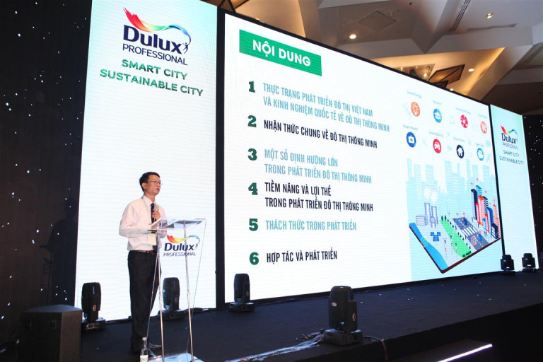 Diễn giả TS. KTS. Trần Quốc Thái, Phó Cục trưởng Cục Phát triển Đô Thị, Bộ Xây Dựng Việt Nam chia sẻ về phát triển đô thị thông minh, bền vững tại Việt Nam: “Một đô thị thông minh bền vững là một đô thị sáng tạo sử dụng ICT và các phương tiện khác để nâng cao chất lượng cuộc sống, nâng cao hiệu quả vận hành và các dịch vụ cũng như khả năng cạnh tranh của đô thị, đồng thời đảm bảo đáp ứng được nhu cầu của các thế hệ hiện tại và tương lai về kinh tế, xã hội, môi trường“. Ông cũng đã nêu lên thực trạng phát triển đô thị Việt Nam hiện nay, nhận thức chung về đô thị thông minh và tiền năng, lợi thế trong phát triển.