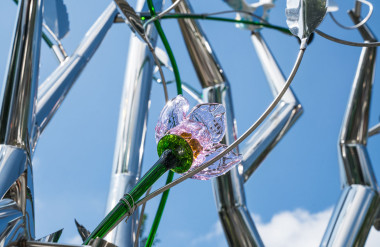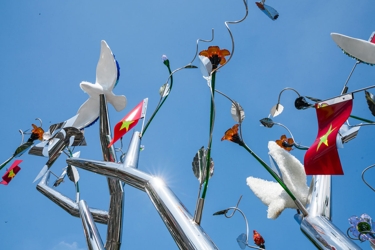 Khác với bề mặt gồ ghề của các tác phẩm trước, lần này thân cây được mài nhẵn, phay xước ánh kim, trở thành biểu tượng trừu tượng của sự sống và tinh thần vươn lên. Trên bề mặt ấy, nghệ sĩ điểm xuyết hoa, lá, chim bồ câu, chong chóng bằng thủy tinh, gốm và thép không gỉ – nơi sự tương phản giữa cứng và mềm, rắn và mong manh, được hòa quyện thành một ngôn ngữ cân bằng, mở ra đối thoại giữa nghệ thuật đương đại và thủ công truyền thống.