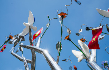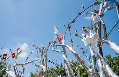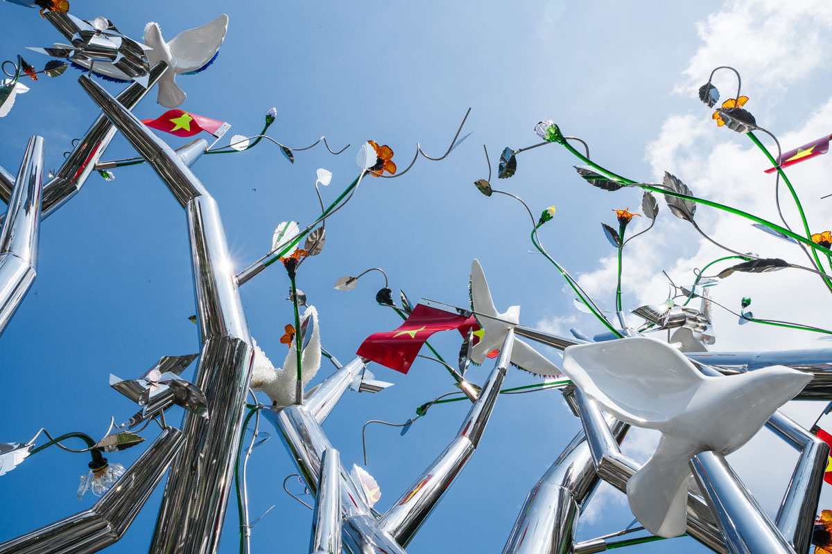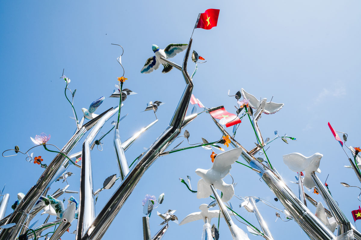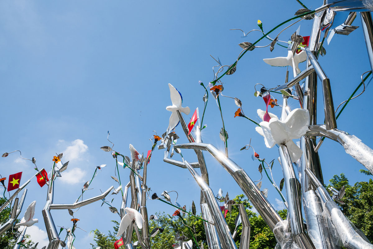 Tác giả Tia-Thủy Nguyễn chia sẻ:“Tôi luôn bị cuốn hút bởi sự sống, một thứ “vô hình – hữu hình”, mong manh và kiên cường. Với “Kết Đoàn”, tôi không tái hiện lịch sử hay dựng lại một thời điểm, mà chỉ lắng nghe và thắp sáng những chuyển động thầm lặng còn vang vọng ở hiện tại. Tác phẩm là một sắp đặt tại không gian mở, nơi thiên nhiên, ký ức và con người giao thoa trong ánh sáng và sự chuyển động. Mỗi thân cây bằng thép không gỉ là một dòng chảy của năng lượng; mỗi bông hoa, cánh chim là một chi tiết mang tinh thần thủ công, văn hóa và cảm xúc.”