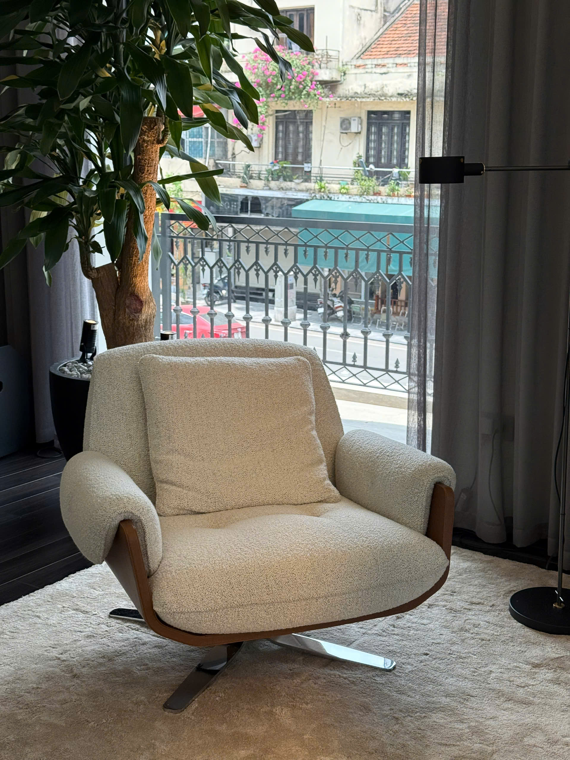 Cầu thang dẫn lên tầng hai được thiết kế kết hợp giữa chất liệu gỗ ấm áp và lớp sơn mài cao cấp, mang đến cảm giác vừa gần gũi vừa sang trọng. Tại đây, không gian trưng bày mở đầu bằng một sảnh nhỏ, nơi giới thiệu chiếc ghế bành Kendall do bộ đôi GamFratesi thiết kế.