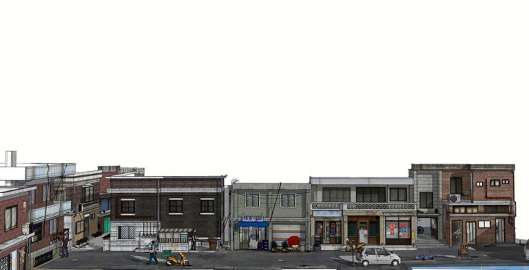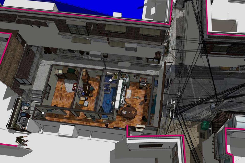 Cả con hẻm khu nhà nghèo cũng được xây mới: bao gồm 20 tòa nhà, 40 hộ dân, mỗi hộ dân được team thiết kế tạo một câu chuyện riêng để trang trí nhà khác nhau (có 1 bà cô thu nhặt đồng nát, một nhà thì bán đồ ăn vặt với toàn hộp bánh cá và tương, một người đưa sữa, một nhà khác là tiệm sửa đồ điện của cựu binh).