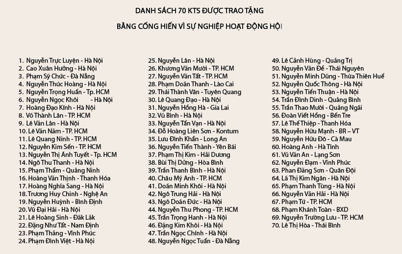Kiến trúc sư Việt Nam đang dần trưởng thành cả về mặt số lượng và chất lượng, chính vì thế, nhân Lễ kỷ niệm 70 năm thành lập Hội KTS Việt Nam, Hội KTS Việt Nam đã trao tặng Bằng cống hiến cho 10 KTS trẻ tiêu biểu; Bằng cống hiến cho 70 KTS tiêu biểu của các thế hệ KTS và vinh danh 5 gia đình có 3 thế hệ trực hệ là KTS.