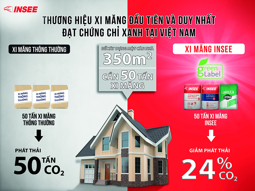 Với dòng sản phẩm xi măng và bê tông “nhãn xanh” đầu tiên tại Việt Nam, INSEE tham vọng mở ra xu hướng xây dựng một quốc gia xanh hơn, cũng như mang đến sự phát triển bền vững cho cộng đồng. Ông Nguyễn Công Minh Bảo (Giám đốc Bền vững và Truyền thông) nhấn mạnh: “Cam kết phát triển bền vững của chúng tôi không chỉ dừng lại ở việc giảm phát thải của dấu chân cacbon trong quy trình sản xuất mà còn hướng đến phát triển các sản phẩm thân thiện với môi trường của Công ty”. Được biết dòng sản phẩm “nhãn xanh” này không chỉ mang lại chất lượng ổn định vững chắc cho công trình, mà còn góp phần giảm bớt một lượng lớn khí CO2 thải ra môi trường.