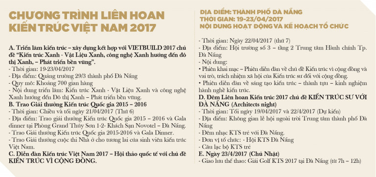 Kế hoạch kèm chương trình cụ thể xem tại: https://www.tapchikientruc.com.vn/tin-tuc/tin-hoi-kts-viet-nam/ke-hoach-chuc-lien-hoan-kien-truc-viet-nam-2017.html