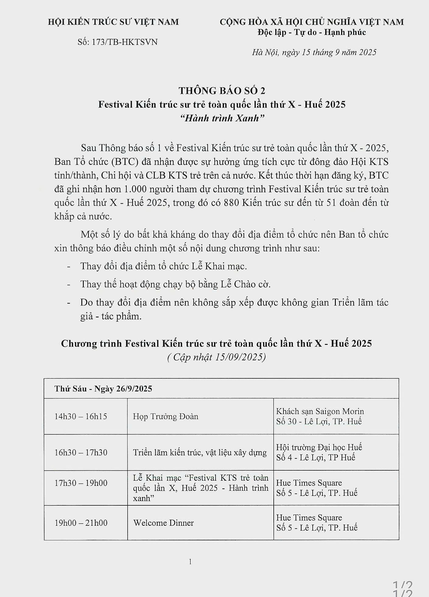 Vừa qua, BTC Festival Kiến trúc sư trẻ toàn quốc lần thứ X – Huế 2025 đã ra thông báo số 2 về việc thay đổi địa điểm và một số hoạt động diễn ra tại sự kiện lần này.
