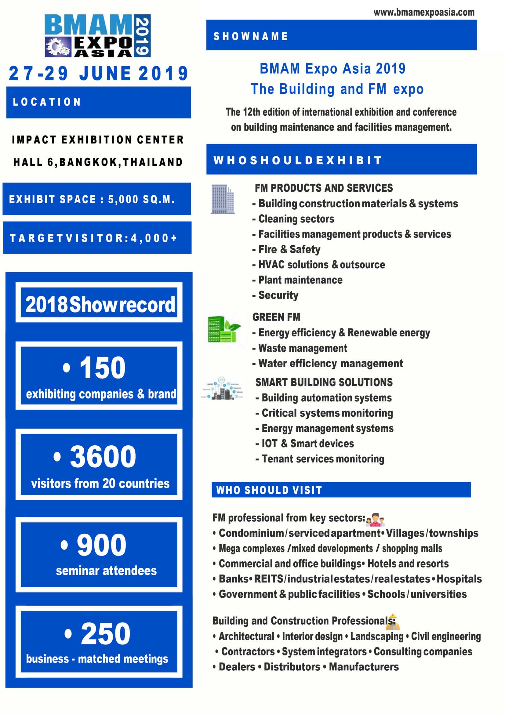 BMAM Expo Asia là chương trình Triển lãm và Hội thảo quốc tế thường niên về lĩnh vực công nghệ quản lý tòa nhà được tổ chức bởi công ty IMPACT Exhibition Management . Đây là sự kiện lớn giới thiệu những công nghệ mới nhất, các dòng sản phẩm hiện đại nhất hiện nay trong lĩnh vực này. Năm 2018, sự kiện được tổ chức với hơn 6000 m2 diện tích triển lãm cho 150 thương hiệu khác nhau đến từ 7 quốc gia đã thu hút gần 4000 khách hàng từ 20 quốc gia trên thế giới tham dự. Chương trình chào đón khách thăm quan từ nhiều lĩnh vực kinh doanh khác nhau bao gồm các cơ quan chính phủ và doanh nghiệp nhà nước; các chủ đầu tư xây dựng; phát triên dự án; kiến trúc sư; nhà thầu; công ty bất động sản và công ty sản xuất; các công ty trong lĩnh vực khách sạn nghỉ dưỡng,… tới tham dự, nhắm tìm ra các giải pháp tổng thể cho ngành quản lý vận hành công trình.