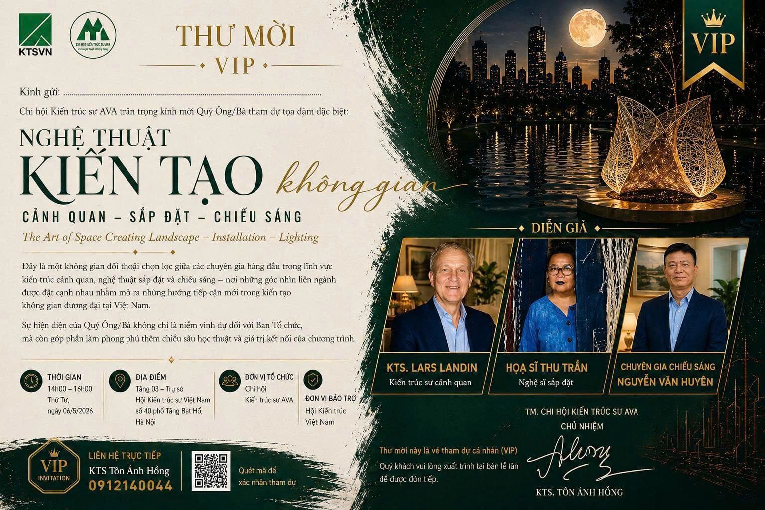 Trong bối cảnh đô thị hóa nhanh và nhu cầu ngày càng cao về chất lượng sống, ranh giới giữa kiến trúc, nghệ thuật thị giác và kỹ thuật chiếu sáng đang dần bị xóa nhòa. Nhìn thấy rõ cơ hội cũng như thách thức từ sự vận hành tách biệt giữa các ngành, Chi hội Kiến trúc sư AVA (trực thuộc Hội Kiến trúc sư Việt Nam) tổ chức tọa đàm chuyên đề “Nghệ thuật Kiến tạo Không gian: Cảnh quan – Sắp đặt – Chiếu sáng”, hứa hẹn mở ra một diễn đàn đối thoại liên ngành hiếm có.