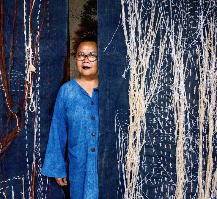 Phản biện và bổ trợ cho “chất nền” ấy, họa sĩ Thu Trần – nghệ sĩ sắp đặt với ngôn ngữ độc bản từ lụa, tơ tằm, vải thủ công – sẽ chia sẻ về cách chị kiến tạo những không gian giàu tính kết nối. Những tác phẩm quy mô lớn như “Giăng tơ” (Hội An, 2019) hay “Trở về” (Sơn La, 2021 – với 5.000m vải lụa) cho thấy khả năng chuyển hóa vật liệu mềm thành thông điệp nghệ thuật mạnh mẽ: “Nếu chỉ là hội họa giá vẽ sẽ không thỏa mãn niềm đam mê.”