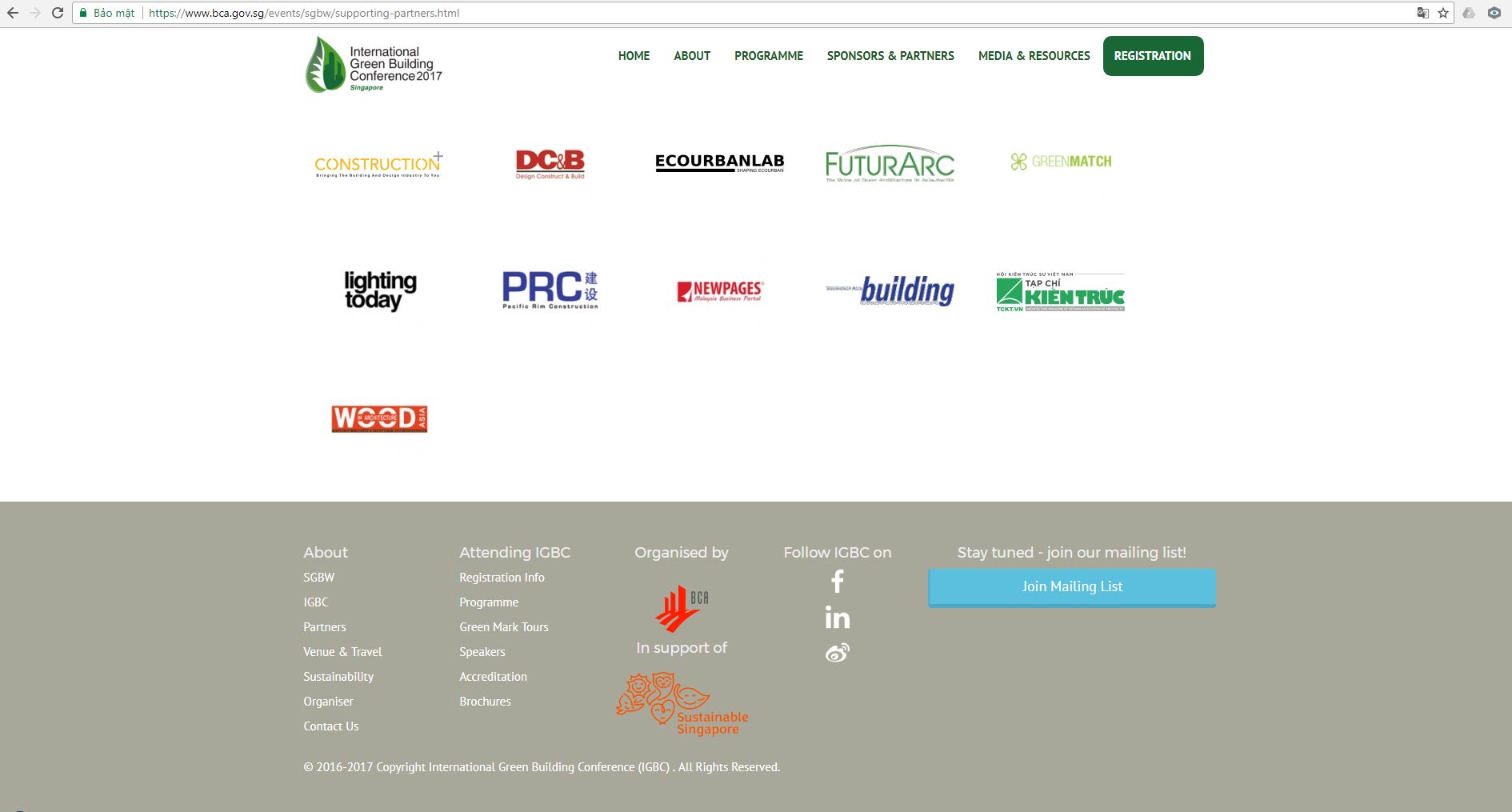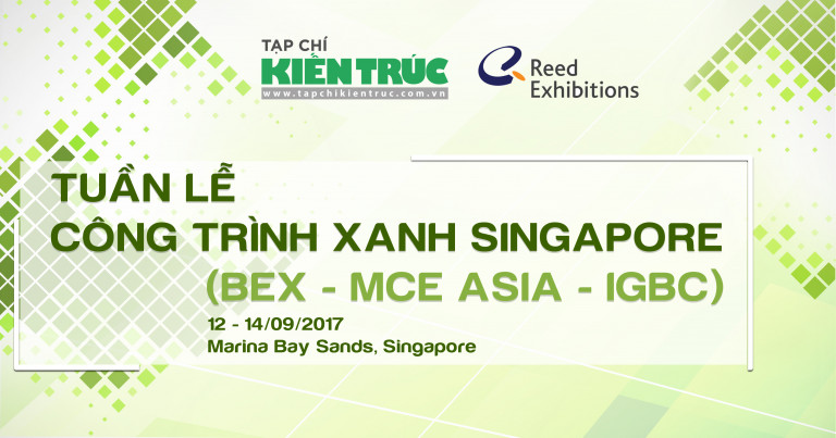 Theo lời đề nghị từ phía Công ty TNHH RELX (Singapore) – Reed Exhibitions, Tạp chí Kiến trúc – Hội Kiến trúc sư Việt Nam sẽ tham gia bảo trợ truyền thông cho ba sự kiện lớn diễn ra tại Singapore hưởng ứng Tuần lễ Công trình xanh Singapore (SGBW) từ 12-14/9/2017, gồm: Triển lãm Công trình Xanh (BEX); Triển lãm hiệu quả năng lượng (MCE Asia) và Hội nghị Xây dựng Xanh Quốc tế (IGBC).