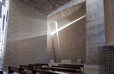 Lấy cảm hứng từ địa hình núi lửa, công trình mang hình khối mạnh mẽ, bề mặt thô mộc, đối lập với bối cảnh xung quanh. Những khe hẹp giữa các cấu trúc, được lấp đầy bởi kim loại và kính điêu khắc, tạo nên hiệu ứng lọc ánh sáng tự nhiên độc đáo, góp phần hình thành không gian nội thất tối giản và đậm chất tâm linh.