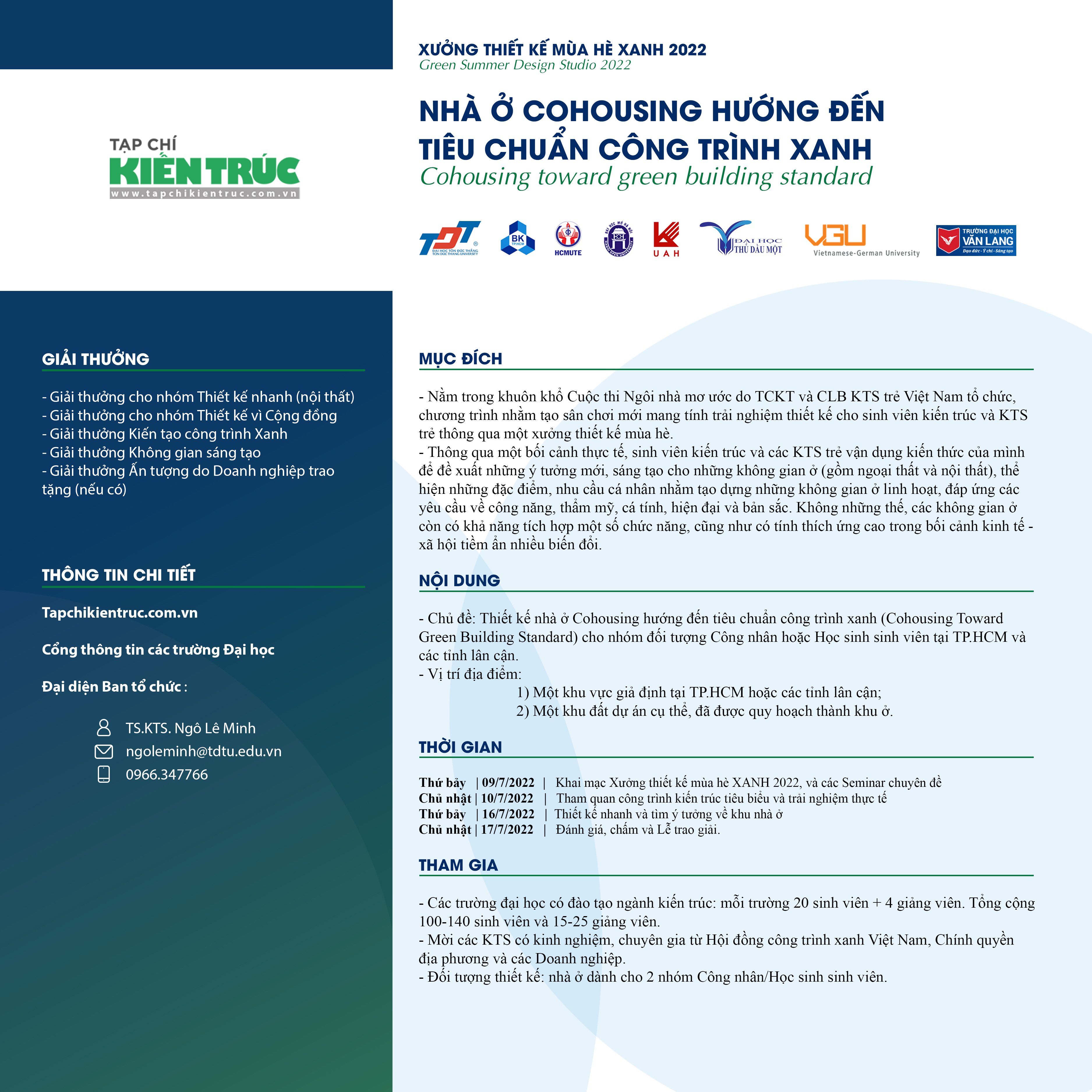 - Xưởng thiết kế mùa hè XANH 2022 – NHÀ Ở COHOUSING HƯỚNG ĐẾN TIÊU CHUẨN CÔNG TRÌNH XANH (Green Summer Design Studio 2022 – COHOUSING TOWARD GREEN BUILDING STANDARD)